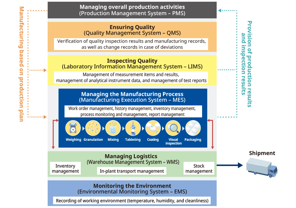 The manufacturing of pharmaceuticals is subject to various strict regulations, requiring thorough production and quality control. The MES visualizes and records work instructions, implementation details, progress status, and production data for each process according to the production plan, enabling manufacturing in compliance with GMP.