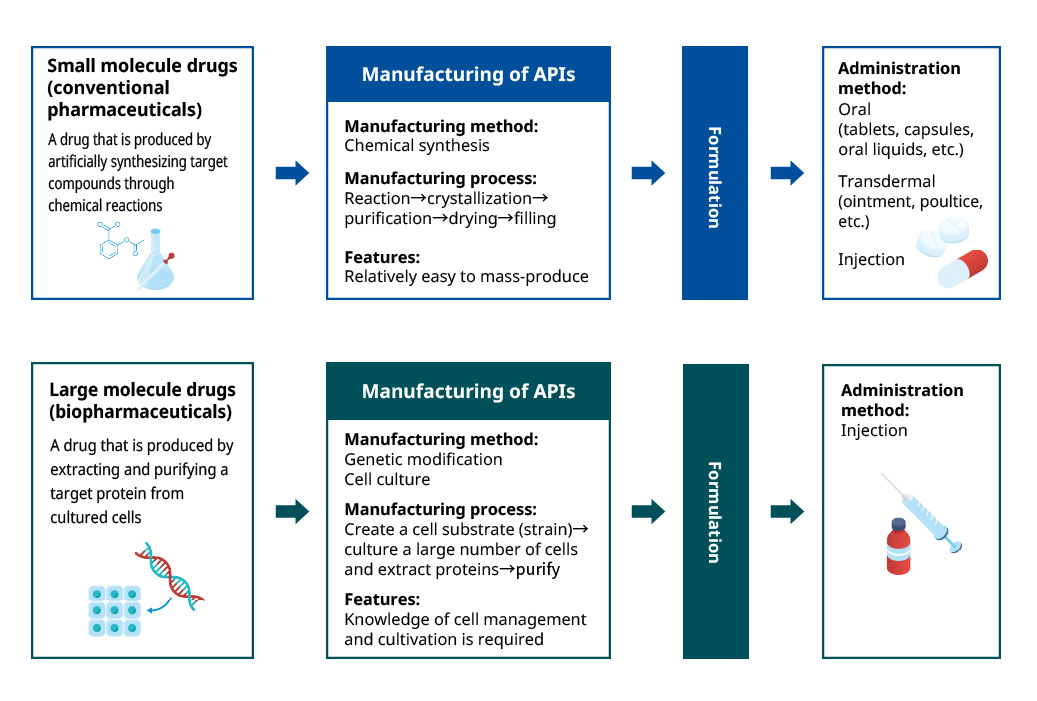 Pharmaceuticals come in various types and forms and are manufactured using chemical synthesis or cell cultures. Yokogawa contributes broadly across the pharmaceutical spectrum—from the production of active pharmaceutical ingredients (APIs) to final formulation—for small molecule drugs (conventional pharmaceuticals), medium molecule drugs (e.g., peptide-based), and large molecule drugs (biopharmaceuticals).