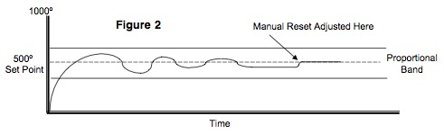 To eliminate the inherent offset observed with proportional control, a manual reset function can be used. Virtually no process requires precisely 50% output to maintain the process variable at the set point. An offset will be present. Manual reset allows the user to bias the output accordingly to compensate for the steady state offset using P only. Refer to Figure 2 below.