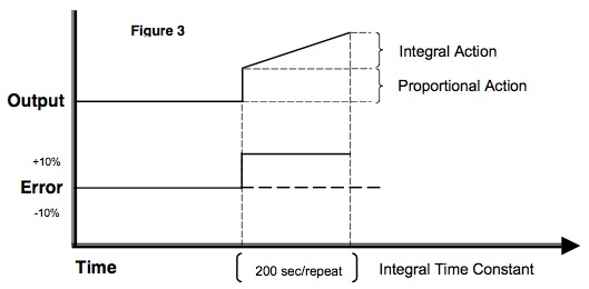 Automatic reset or integral action corrects for any offset between set point and process variable automatically by shifting the proportional band over a pre-defined time. The integral time repeats the proportional action over the time set. Integral redefines the output requirements at the set point until the process variable and set point are equal. Integral engineering units vary by controller manufacturer. Some use repeats/minute (reset rate), minutes/repeat or seconds/repeat. In Figure 3 below, seconds/repeat is used. The integral term is added as follows: