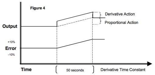 Using derivative (solid line), the control output jumps up, rises in a ramp and then falls back to proportional control action when the error becomes constant. In essence, it applies the "brakes" on the process error by quickly shifting the proportional band. Derivative has no effect on the output if the error is not changing. The derivative term should be approximately ¼ the integral time.