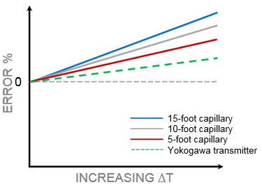 All remote seal systems on the market use fill fluid to 'transmit' the process pressure from the remote diaphragm seal to the pressure sensor in the transmitter. The physical properties of the fill fluid change as process temperature and ambient temperature change causing the transmitter to measure inaccurately. This effect gets worse as the capillaries get longer. The key is to filter out this 'noise' to get an accurate, consistent, reliable measurement. Yokogawa has a superior design, manufacturing process, and features to reduce this 'noise'.