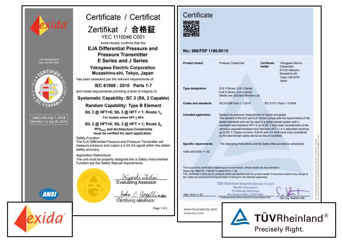 At Yokogawa, safety is never an option. All Yokogawa pressure transmitters are designed and certified to IEC61508:2010 Parts 1 through 7 and IEC61511:2004 Parts 1 through 3 by Exida® and TÜV Rheinland®.