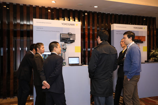 本次NAMUR中国年会主会场外的产品展示区,横河电机展示了横河的生产控制系统CENTUM VP和安全控制系统ProSafe-RS,展示了新的现场仪表:TI系列电磁流量计和质量流量计、TDLS8000激光气体分析仪、EJA-E变送器、VOCs在线监测系统、GC8000气相色谱仪,还有现场无线网络解决方案。