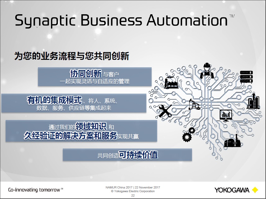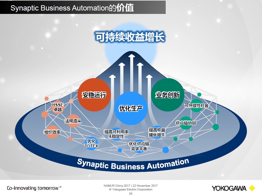 Synaptic Business Automation表现了企业的一种理想的状态,通过融合数据、系统、组织、知识和供应链增加意义和提升竞力。横河电机在客户制造过程的整个生命周期中,通过横河电机的技术优势和创造意义的循环过程,和客户不断创新、为客户创造意义。