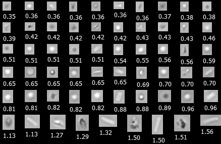 下图展示了在注射制剂中观察到的颗粒示例。每张图像下方均标注了对应颗粒的直径(微米)。FlowCam 还可用于药物制剂与基因疗法开发中的聚集体检测,同时支持材料表征与性能评估。