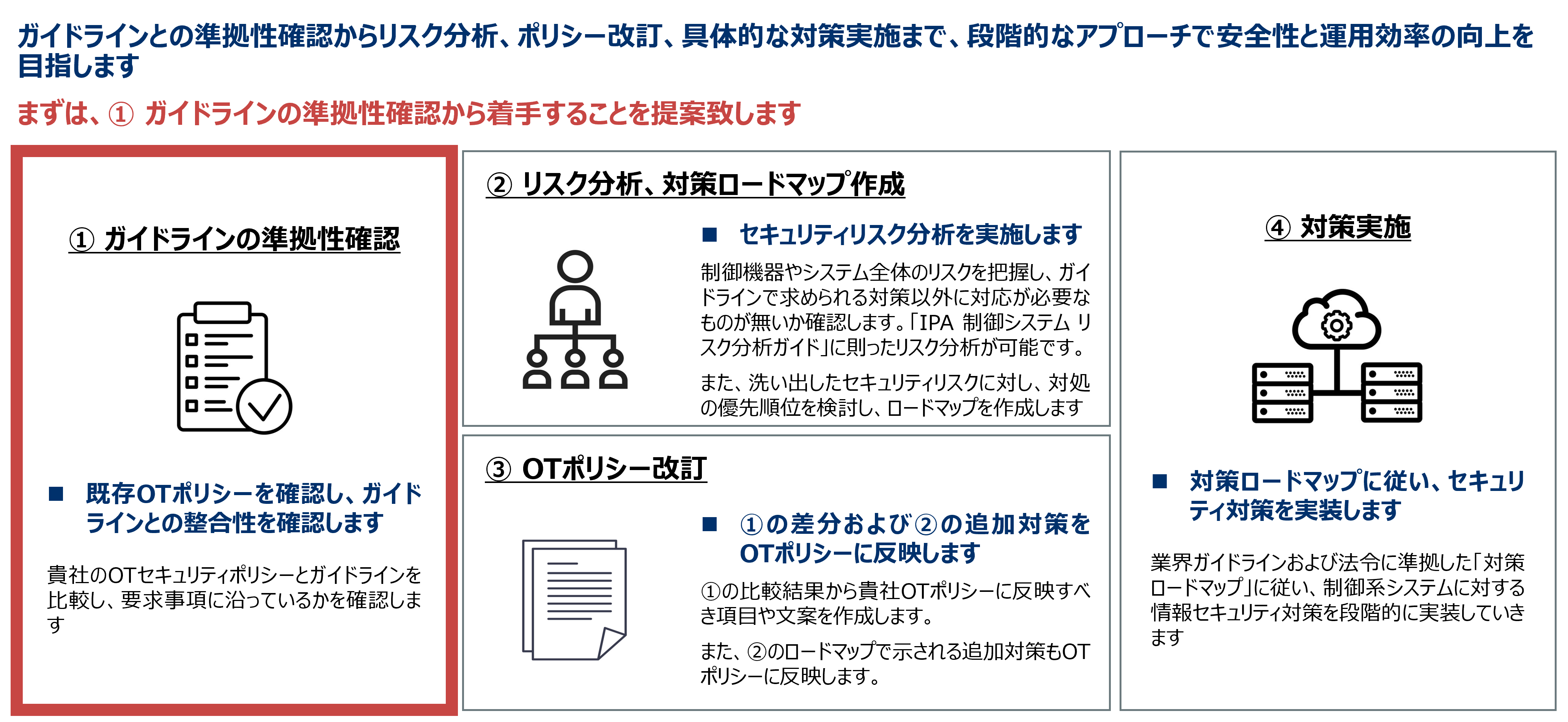 特に制御系システムの分野では、ITシステムとは異なる運用環境や制約が存在するため、一般的なセキュリティ基準をそのまま適用するだけでは十分とは言えません。そのため、ガイドライン準拠性確認は多くの事業者にとって難易度が高く、セキュリティ対策全体の成否を左右する極めて重要なステップとなっています。