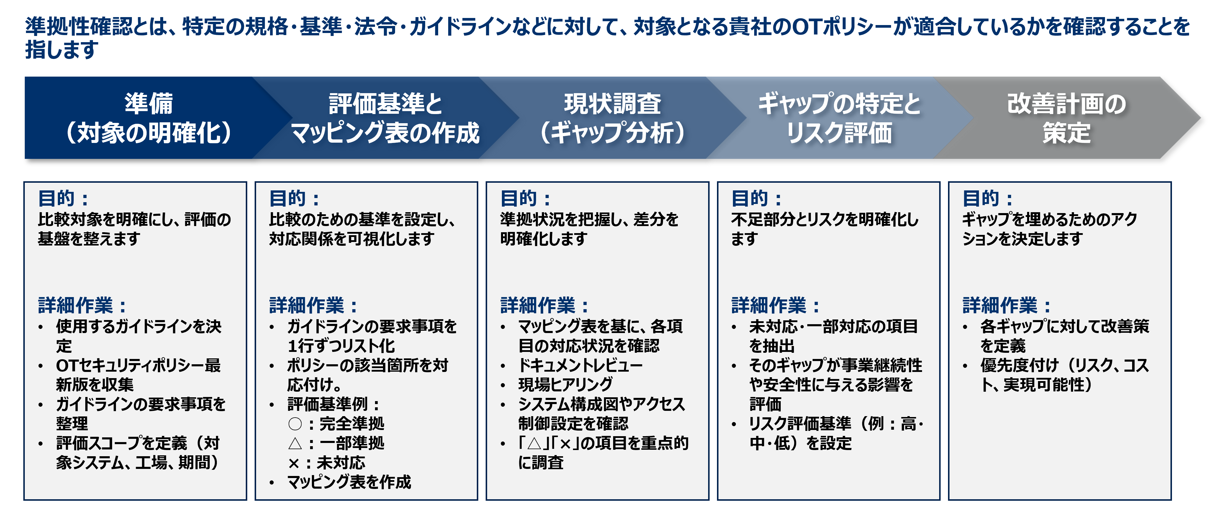 ガイドライン準拠性確認は、単なる文書の照合ではなく、対象となるOTポリシーが業界ガイドラインや法令に適合しているかを体系的に評価するプロセスです。横河デジタルでは、以下のステップに沿って、準拠性確認を効率的かつ確実に進めます。