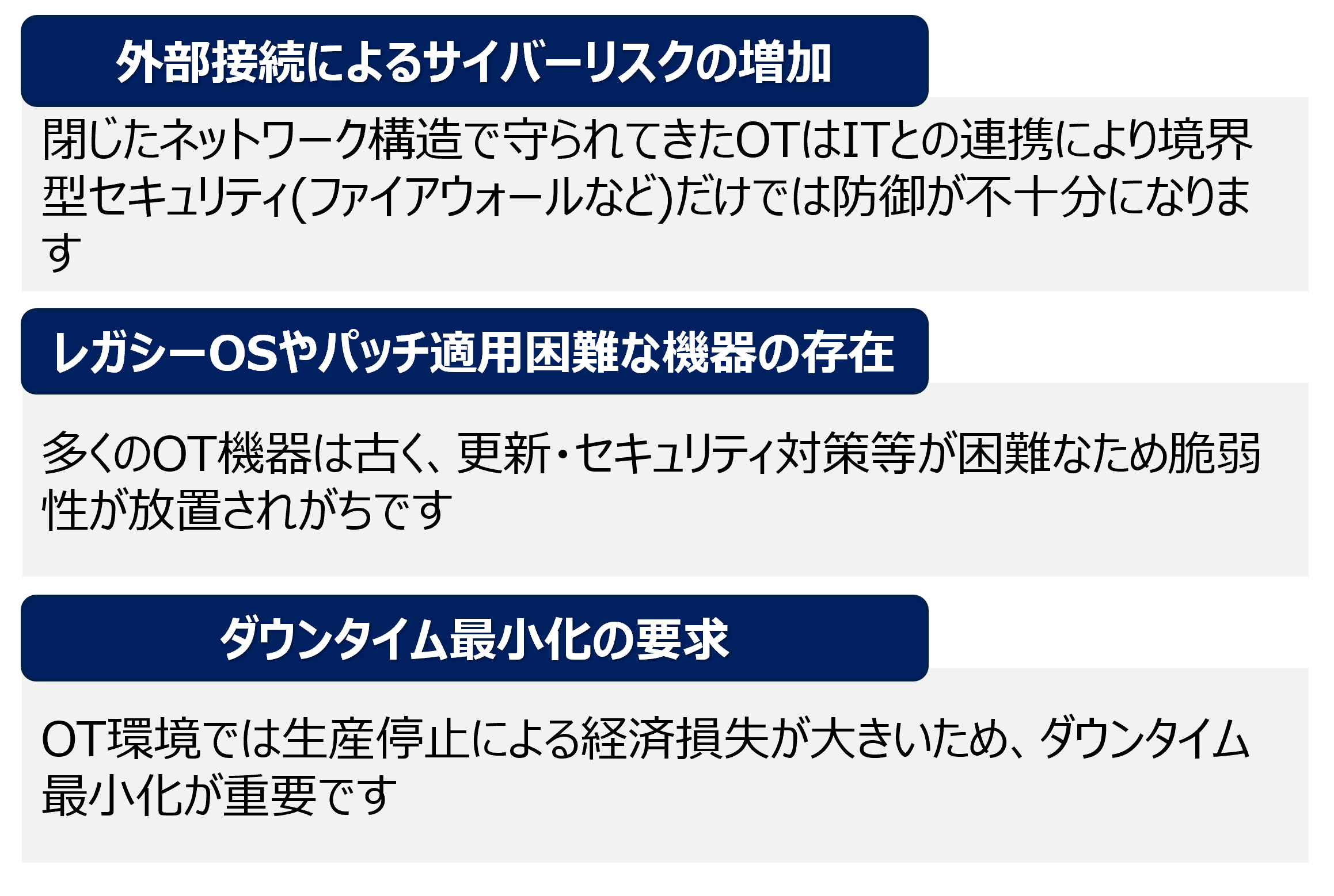 OT環境では、システムの可用性を維持しながら外部からのサイバー攻撃に備えることが不可欠です。近年、従来の閉じたネットワーク構造からITとの連携による開かれた環境への移行が進んでおり、この変化により境界型セキュリティ(ファイアウォール等)だけでは防御が不十分となり、より高度なセキュリティ対策が求められています。さらに、OT機器の多くが古く更新やパッチ適用が困難で脆弱性が残存しやすく、リアルタイム監視体制も不十分なため異常検知や対応が遅れるリスクが懸念されています。