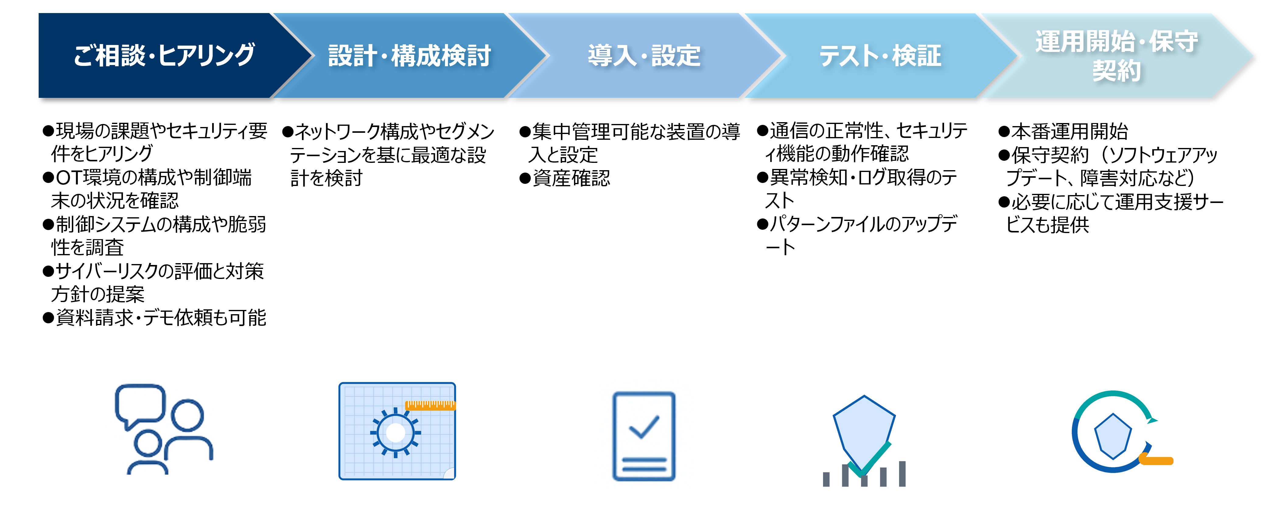 現場の課題やセキュリティ要件をヒアリングし、最適な構成・施策をご提案。導入後も運用支援サービスを提供します。