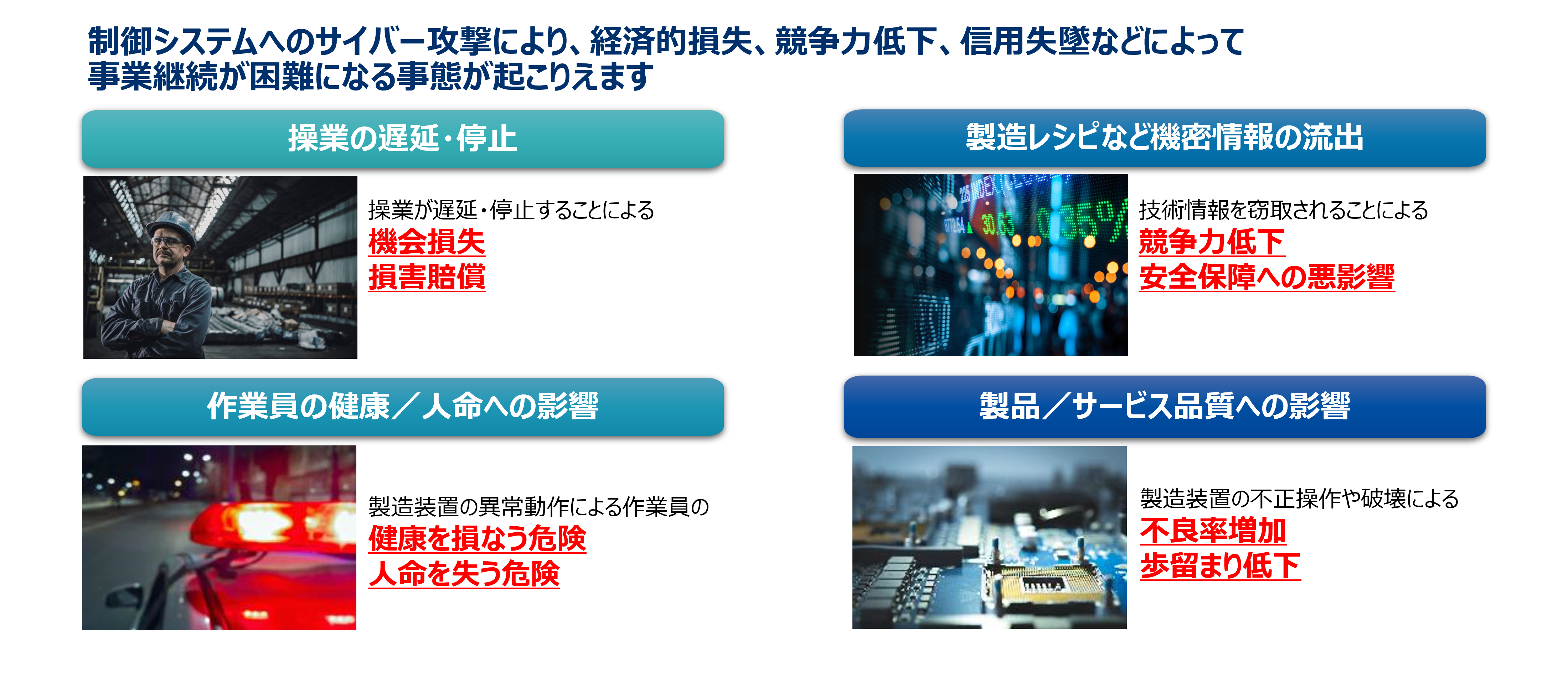 IT側の攻撃でも生産停止が起きている現状を踏まえると、OT側が直接狙われた場合の影響は計り知れません。