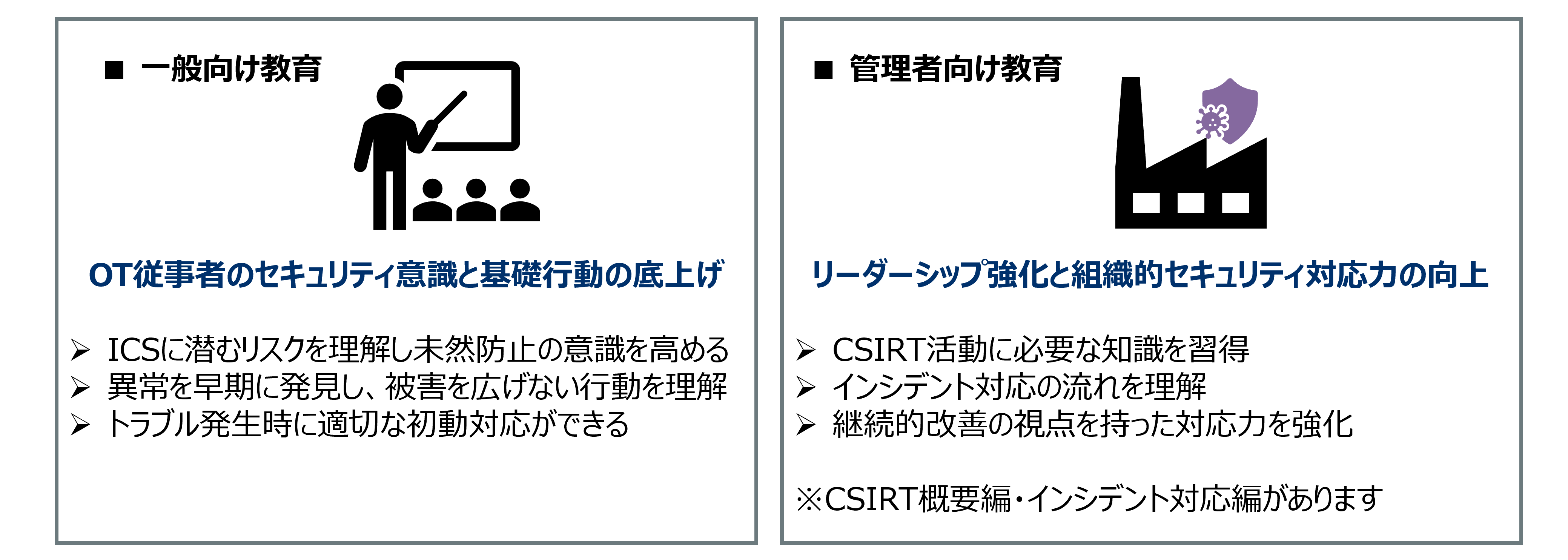 OT環境では攻撃を完全に防ぐことは困難です。そのため、インシデント発生時に迅速かつ的確に対応できる力を現場に備えることが重要です。当社の教育サービスは「予防」と「対応」の両面を強化するために設計されています。