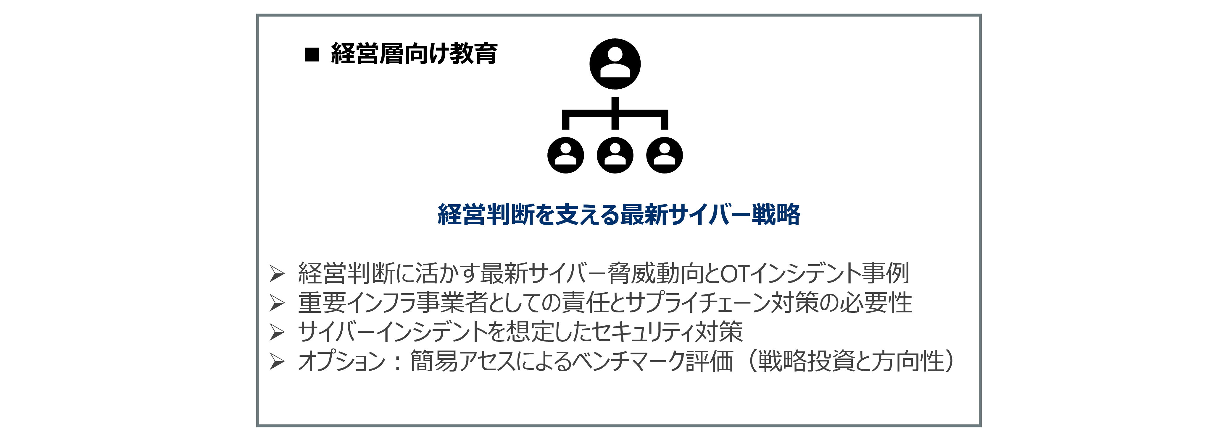 OTセキュリティは現場担当者だけの課題ではありません。当社の教育は、役割に応じたカリキュラムを提供し、組織全体のセキュリティレベルを底上げします。