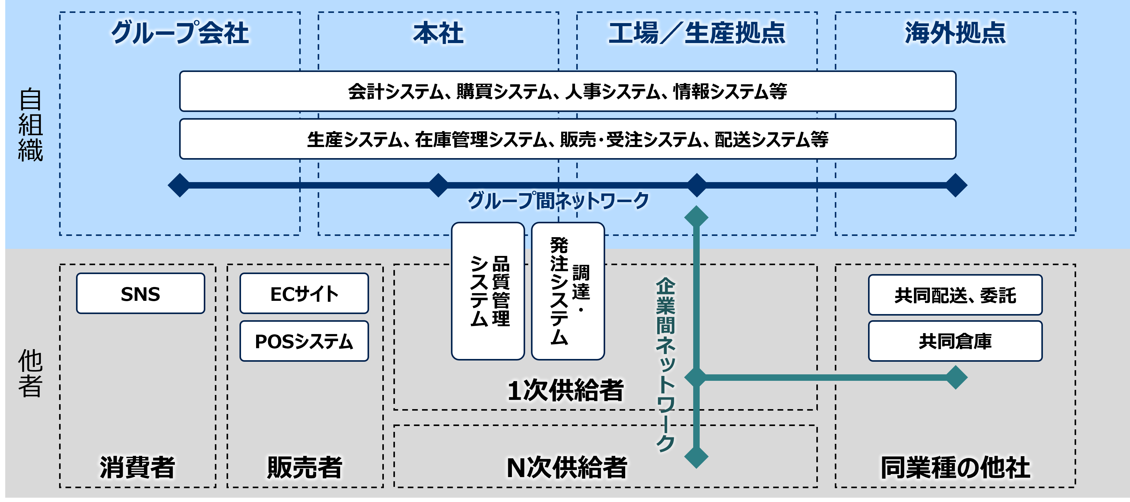 組織外では、サプライヤーと同業他社との間で企業間ネットワークが構成され、調達システム、共同配送などで連携しています。またECサイトやPOSシステム、SNSを通じて販売者、消費者とも接続されています。