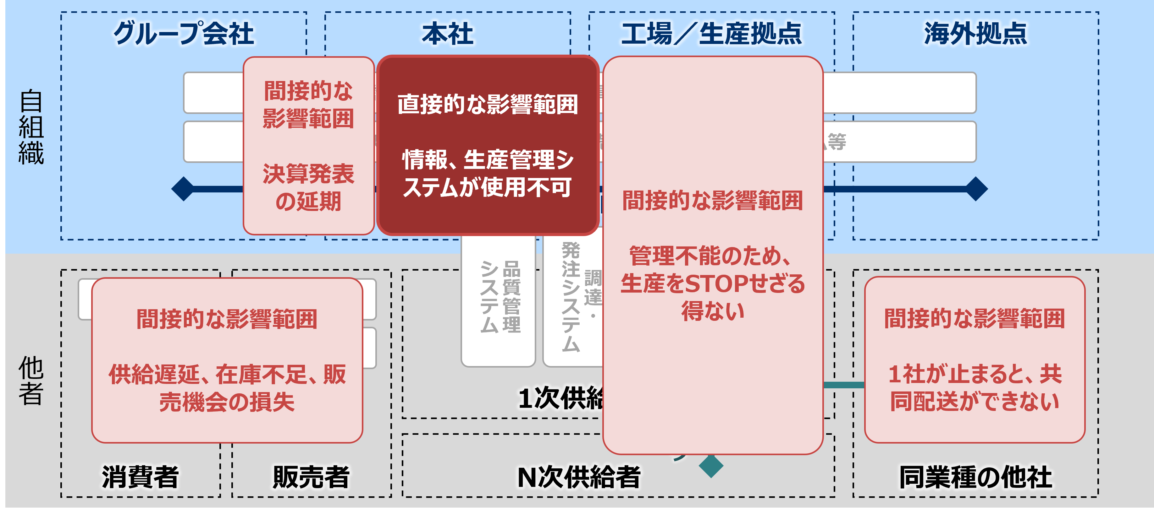 ですが間接的な影響は広範囲に及び、決算発表の遅延が発生しグループ会社やステークホルダーに影響が及ぶ可能性もあります。また、自組織以外への影響としては、生産管理ができず供給者に影響が出る、共同配送をしていた同業他社でも配送ができなくなる、供給遅延や在庫不足による販売者・消費者の販売機会の損失などが考えられます。