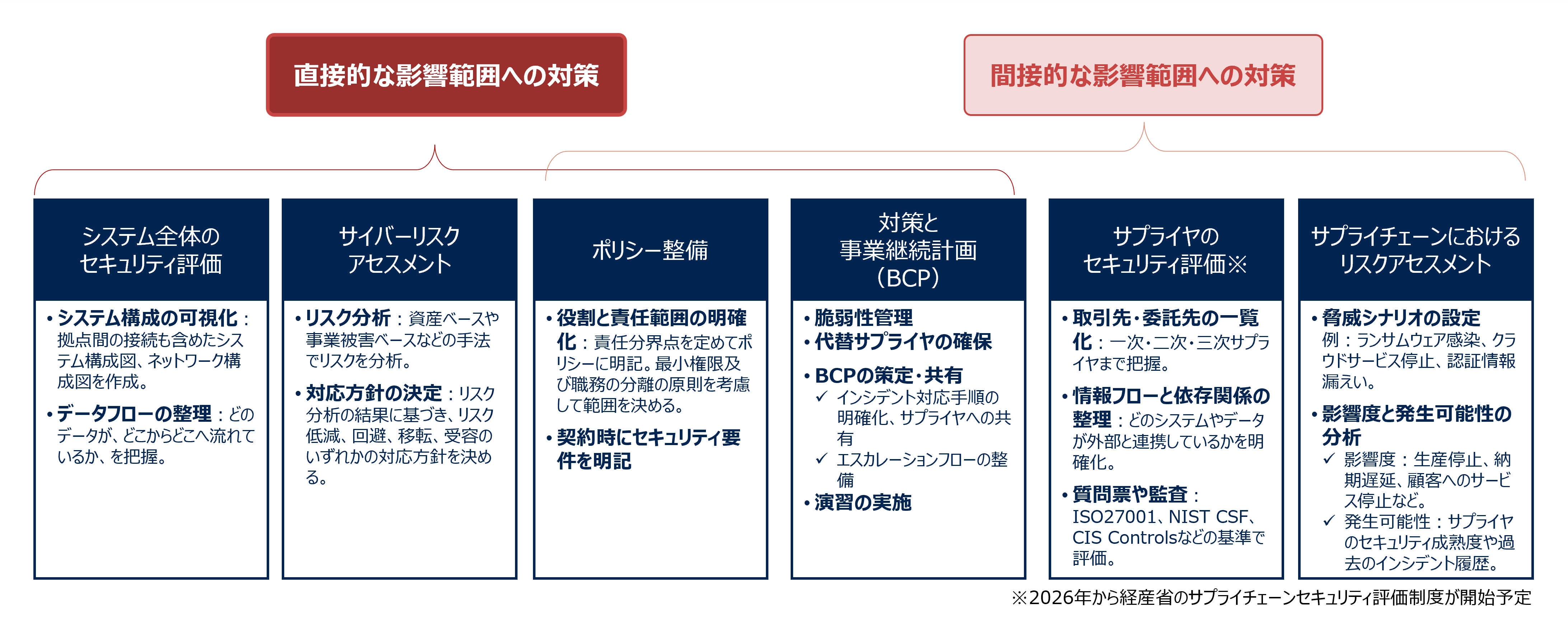 これらを組み合わせることで、システム間や企業間の結びつきを考慮した包括的な対策が可能になります。