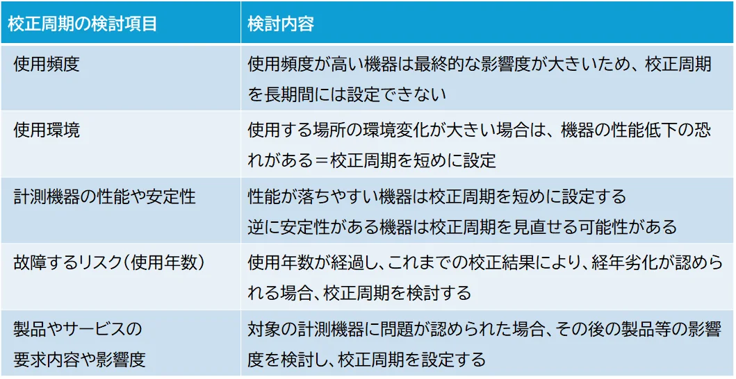 🔹 そのため、組織が計測機器の使用状況とリスクに応じて、校正周期を設定する必要があり、次のようなポイントを考慮する必要があります。