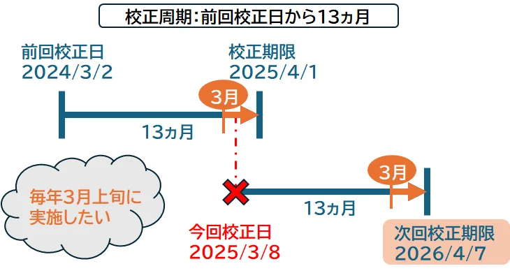 🔹 そこで、例えば、次のように余裕を持たせた周期設定を行うことで、校正日の前倒しを吸収できます。