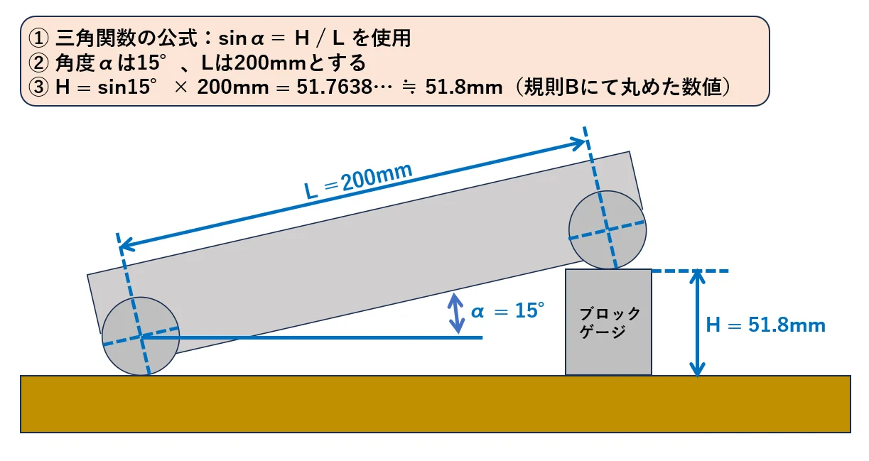 - 30° や 45° 等の任意の角度は「 ブロックゲージ 」という長さの基準器と「 サインバー 」という平面度、平行度や長さなどが規定された器具を使用します。