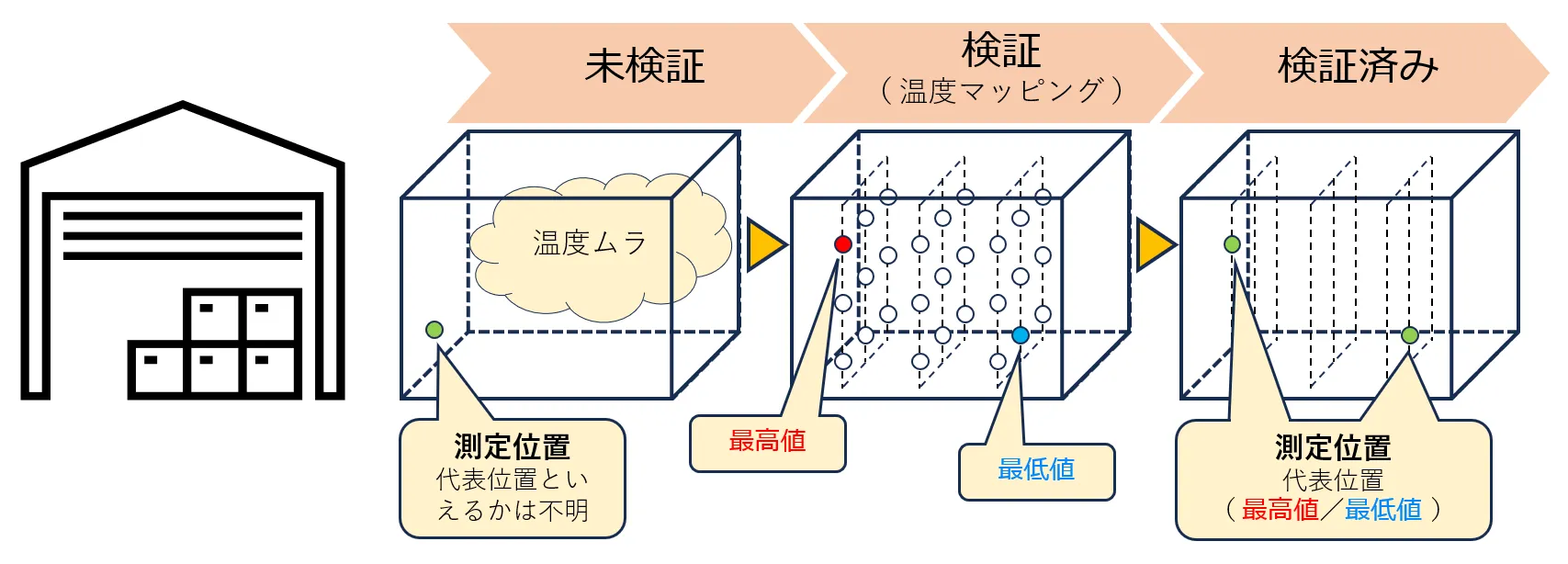 • 温度の分布に影響するような、温度管理の運用や設備の変更(改造/修理など)時には、その影響やリスクを考慮して、再度温度分布の確認をされる場合があります。