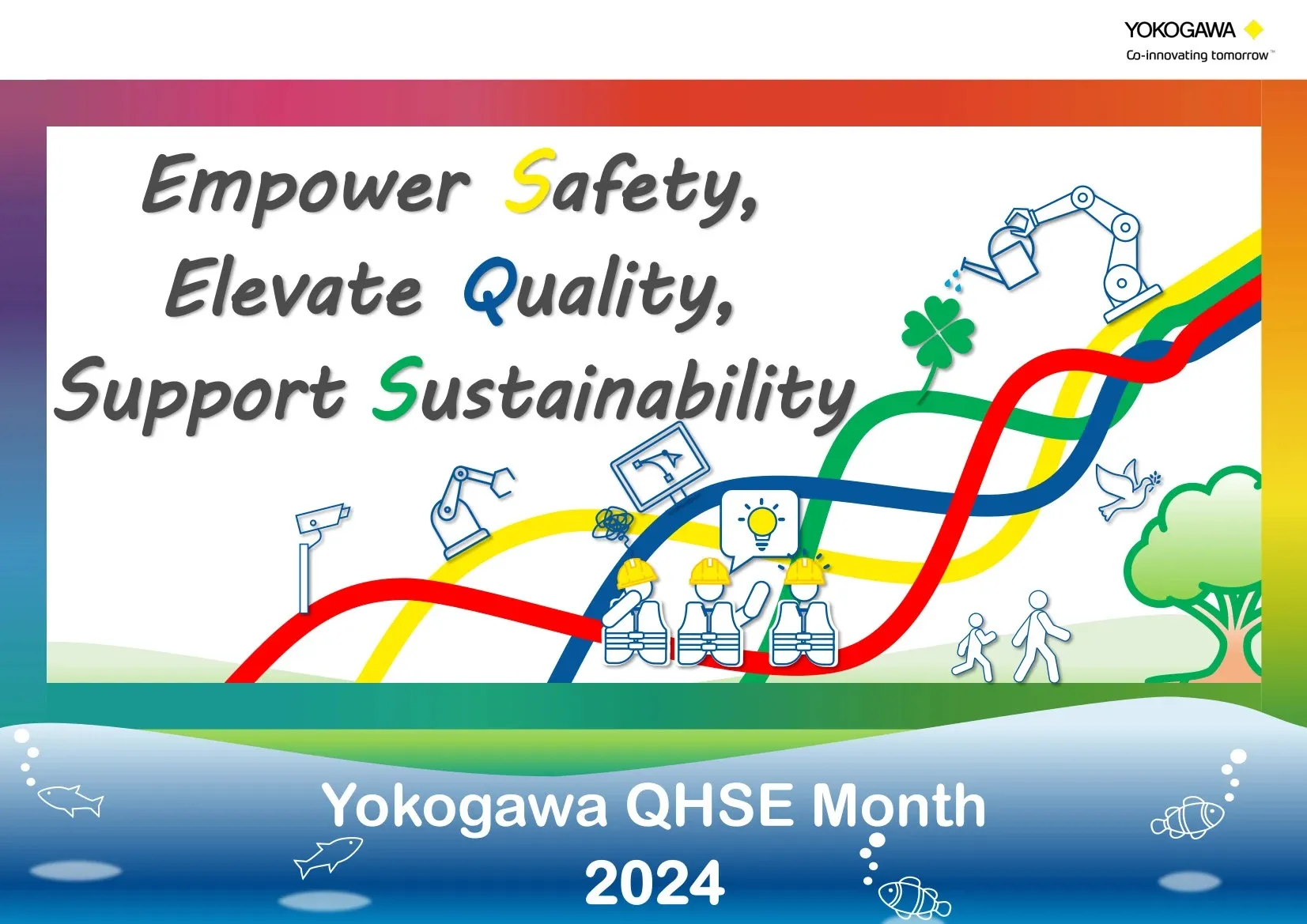 - このスローガンには、すべてのYOKOGAWAグループメンバーが、事業目標達成へ向けた活動を行うとともに、日ごろから安全、品質、持続可能性を意識する文化を育み、積極的かつ意欲的に行動することが重要である、との意味が込められています。