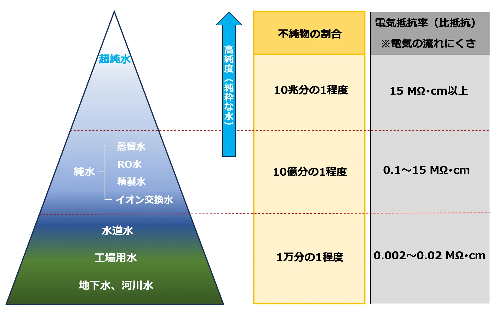 - 超純水とは、純水よりも高度な技術を用いて、限りなく電気抵抗率を 18.24MΩ・cm(純粋な水の電気抵抗率) に近づけた高純度な水のことをいいます。