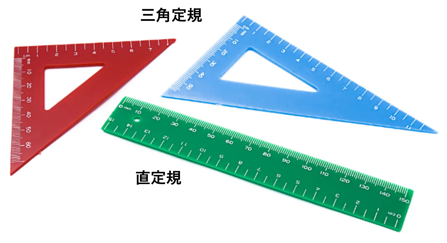 筆記用具をあてて線を引いたり、カッターをあてて用紙を切ったりするための道具で、三角定規や直定規などがあります。目盛がついたものもありますが0の位置が「ものさし」とは異なり少し内側にあります。