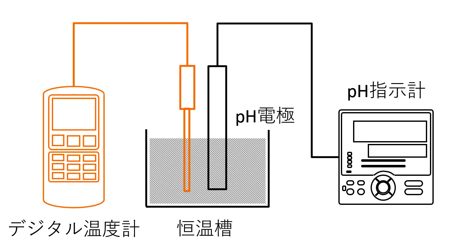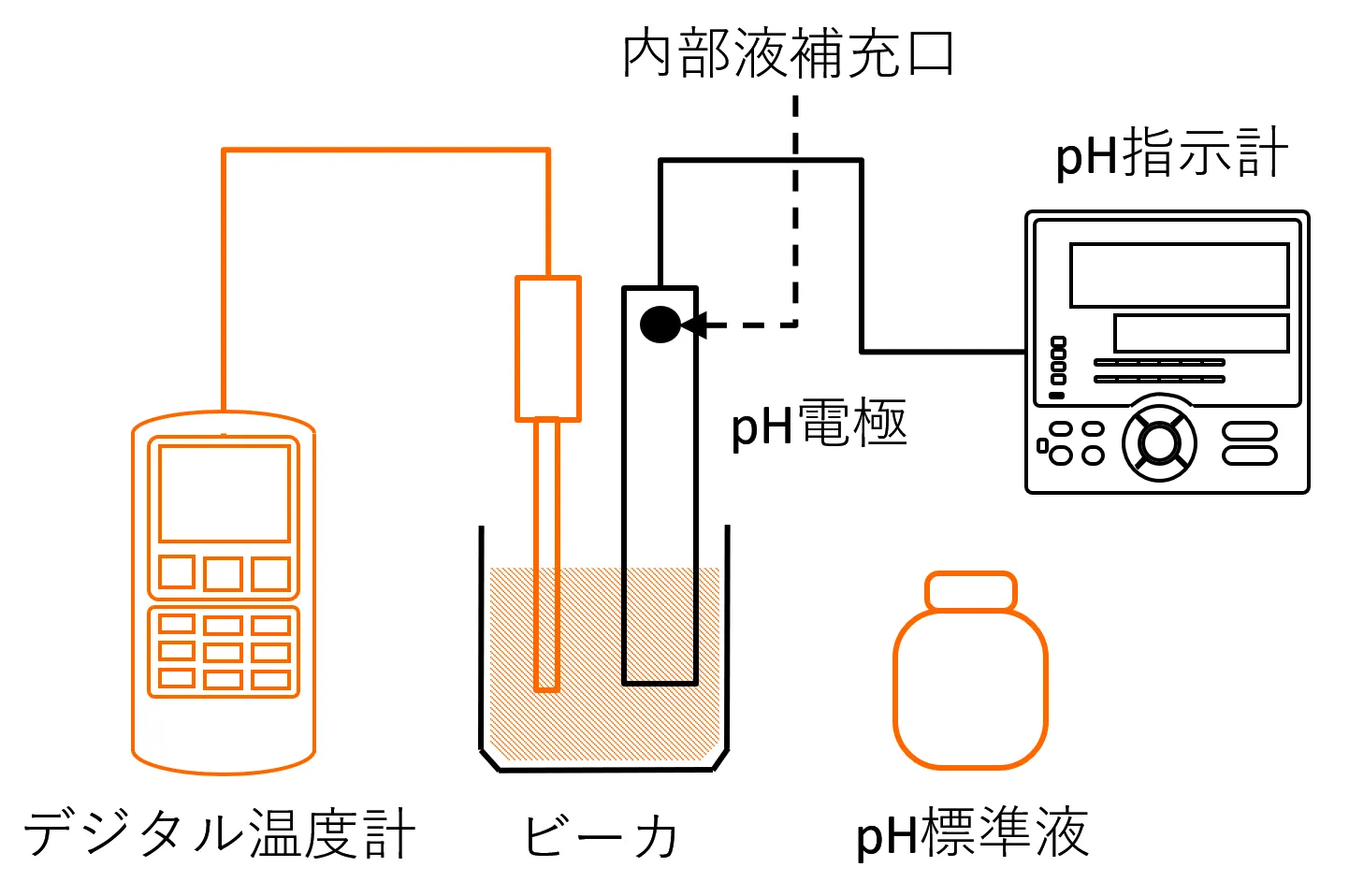 1.標準液校正:pH標準液及びデジタル温度計を使用し、pH値の指示校正を行う。