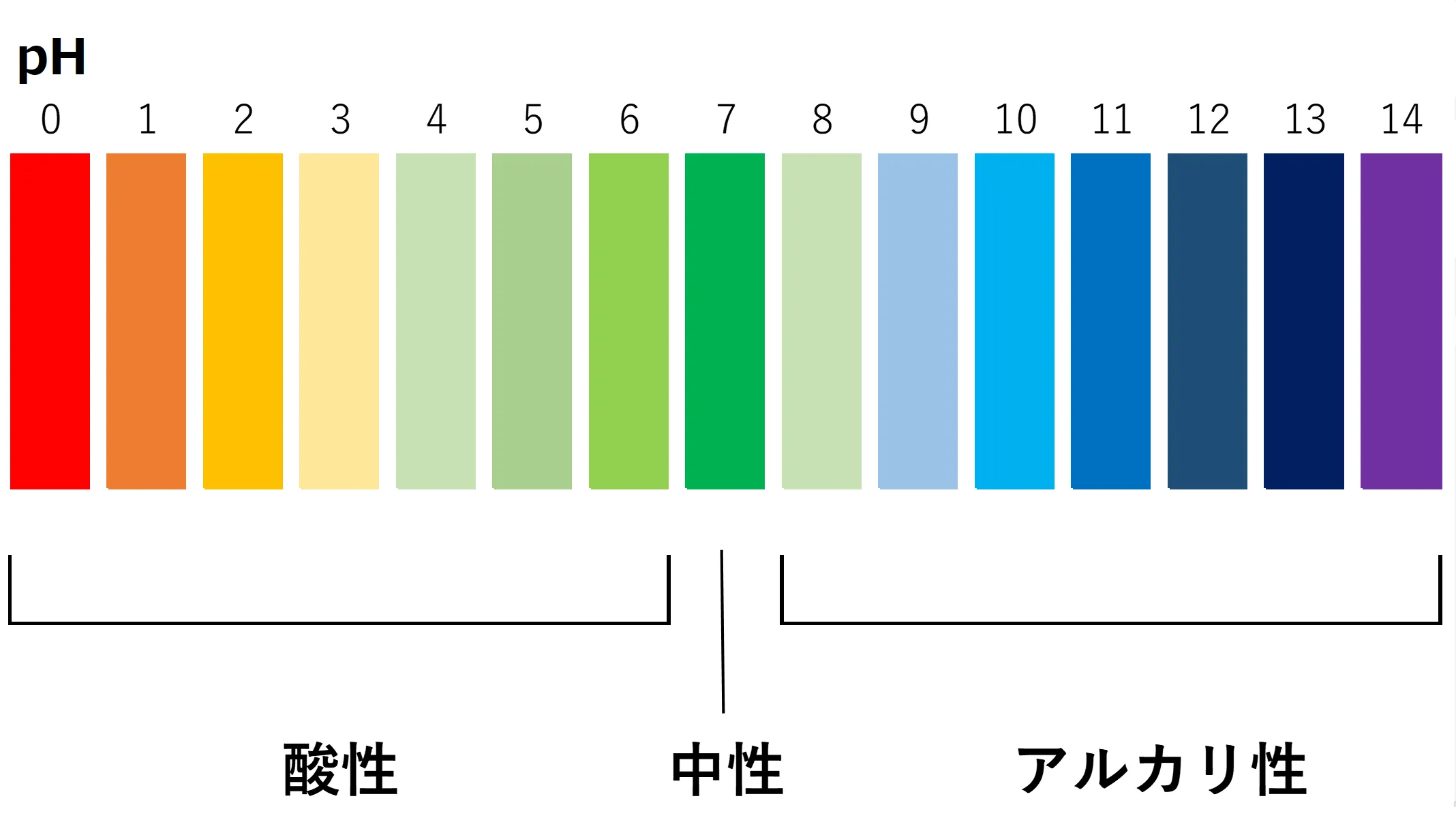 | アルカリ性 | ・水酸化物イオン(OH–)を放出する物質が溶け込んでいる水溶液 ・水素イオン(H+)より水酸化物イオン(OH–)が多いもの ・pH値は7より大きくなる ・pH値は7より数字が14に近づけば強アルカリ性となる | ・石鹸水 ・水酸化ナトリウム水溶液 ・石灰水 ・アンモニア水 |