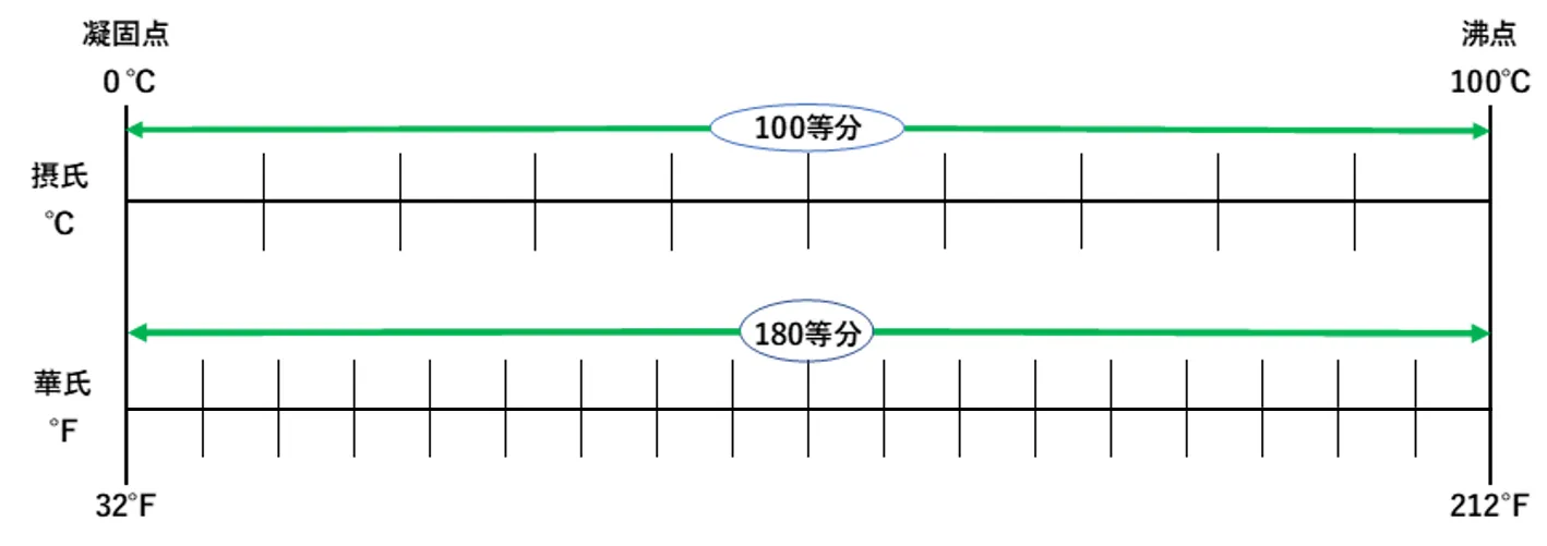 - 一方で華氏とは凝固点を32℉、沸点を212℉とし、その間を均等に180分割しています。