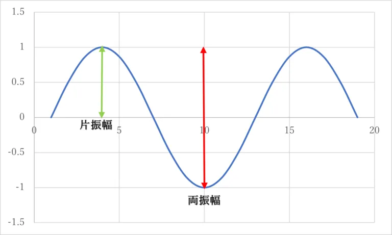 - 因みに片振幅とは波の最大振幅値で、両振幅とは正弦波では片振幅の2倍の値です。