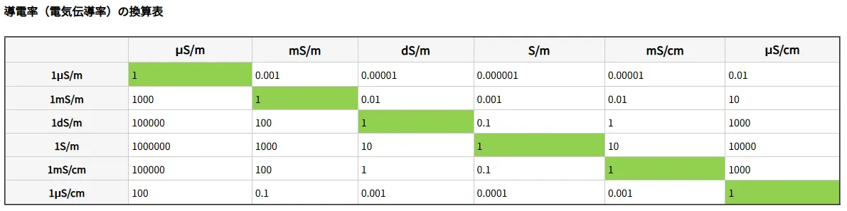 - 導電率の単位は、【 S/cm 】(ジーメンス毎センチメートル)や【 μS/cm 】(マイクロジーメンス毎センチメートル)という単位で従来使用されていましたが、1992年よりSI単位として、【 S/m 】(ジーメンス毎メートル)が使用されるようになりました。
