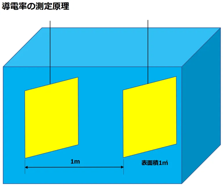 - 導電率計は、面積1m2の2個の平面電極が、距離1mで対向している容器に電解質水溶液を満たして測定した電気抵抗の逆数を示す電気伝導率(=導電率)を測定しています。