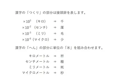 - また、単位の「米」を漢字の「へん」、接頭辞(k【キロ】、m【ミリ】、μ【マイクロ)など)を漢字の「つくり」の部分に割り当てて、さまざまな漢字表記の単位が作られていたようです。