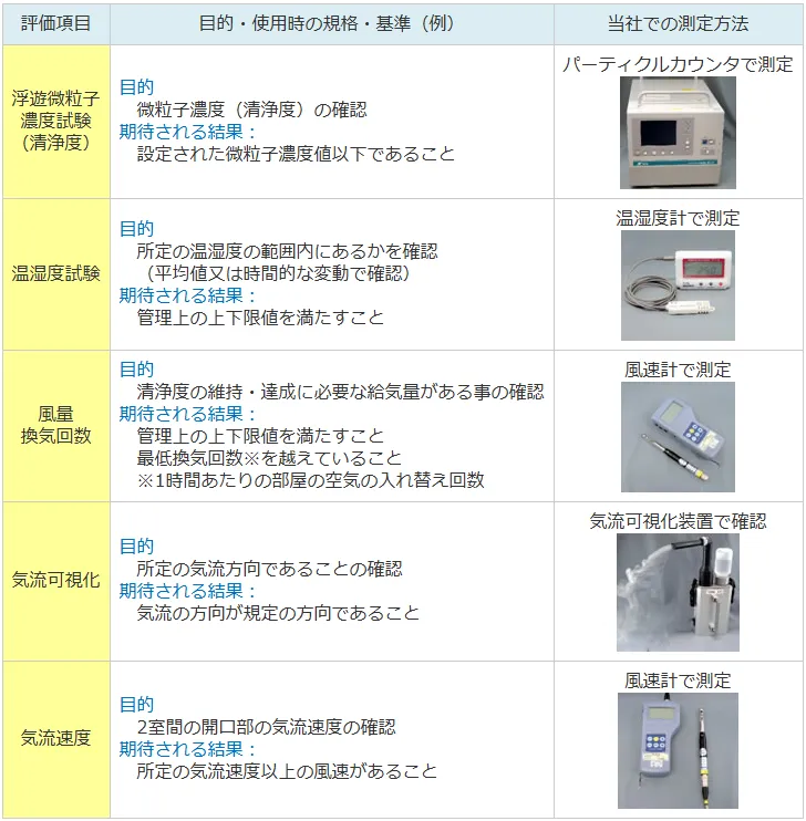 - クリーンルームの評価に関係する評価項目としては、JIS規格※1 に浮遊微粒子濃度試験(清浄度)、差圧試験