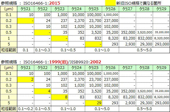 清浄度のクラスはISOクラス1~9で表記されます。 - JIS B9920は、ISO規格(ISO16466-1:1999)を翻訳したもので、清浄度クラスの分類はISO規格と同じでした。