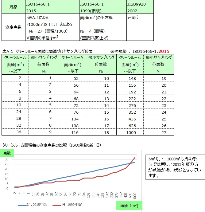 広い部屋になればなるほど、当然サンプリング位置の数も増えます。 - ISO規格の改訂により、新旧規格でサンプリング位置の数の求め方が変わっています。