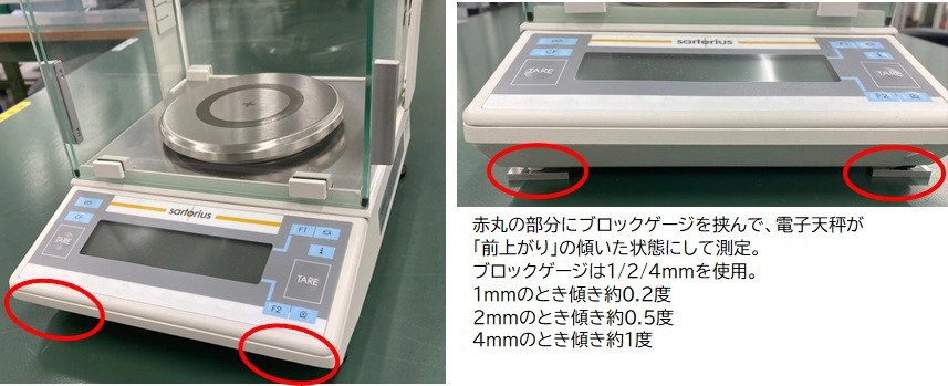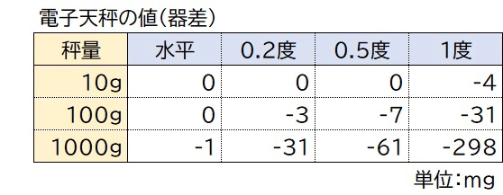 秤量5kgの電子天秤を使用して、水平状態と傾けた状態で10g、100g、1kgの分銅を載せて電子天秤の指示値の差を確認しました。