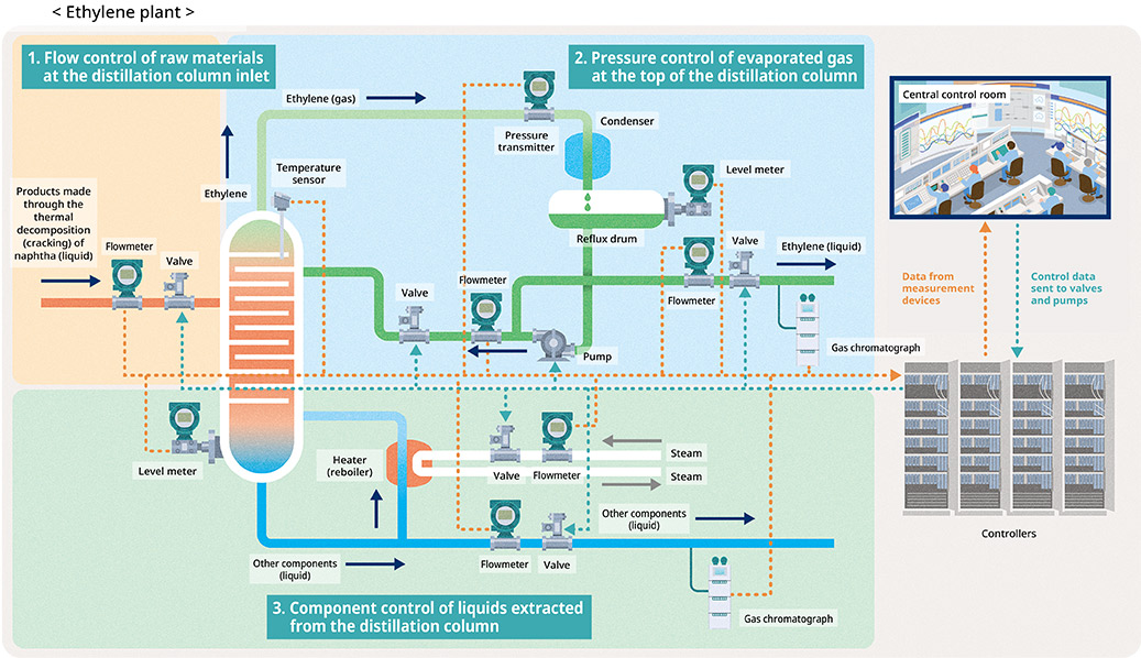 온도 센서, 유량계, 레벨계 및 압력 전송기와 같은 측정 기기들이 에틸렌, 프로필렌 및 기타 석유화학 2차 제품 플랜트의 핵심 위치에 장착하여 원료의 상태를 지속적으로 측정합니다. 측정 및 운전 데이터는 제어 시스템에 의해 수집되며, 플랜트 시설 전반의 운영은 중앙 제어실에서 모니터링, 제어 및 관리됩니다. 플랜트 안전, 생산성 및 설비 이용률은 하루 24시간, 일 년 365일 최적화됩니다.