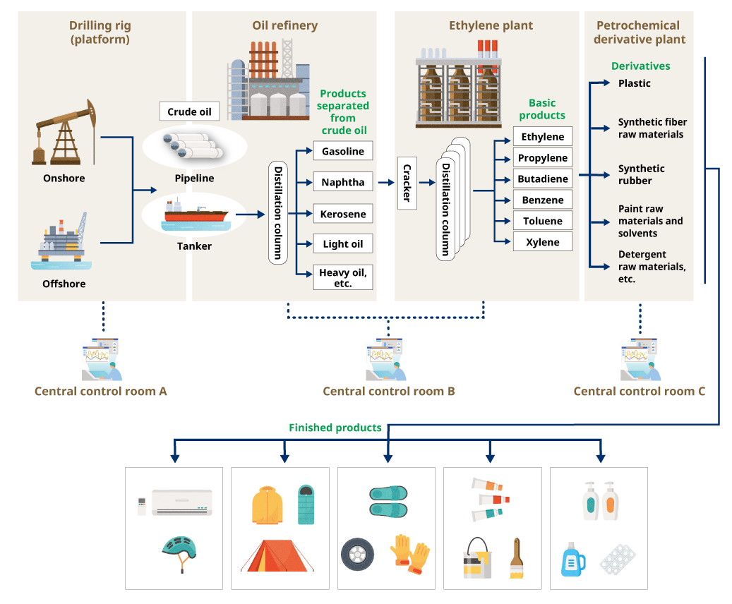 육상 또는 해상 시추 장치(플랫폼)에 위치한 유정에서 나온 원유는 파이프라인과 유조선을 통해 정유소로 운송되며, 그곳에서 증류되어 가솔린 및 등유와 같은 연료와 나프타와 같은 재료를 생산합니다. 열분해 시설에서 나프타는 분해 및 정제되어 플라스틱, 합성섬유 원료 및 페인트 원료와 같은 석유화학 2차 제품(또는 가공 제품)원료로 사용되는 에틸렌 및 프로필렌과 같은 기초 석유화학 제품을 생산합니다. 이러한 제품들은 중간체라고도 불립니다. 그 후 이들은 우리가 주변에서 보는 완제품으로 가공됩니다.