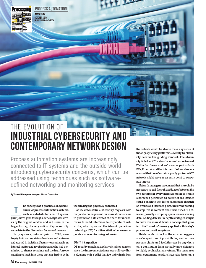 Process automation systems are increasingly connected to IT systems and the outside world, introducing cybersecurity concerns, which can be addressed using techniques such as software-defined networking and monitoring services.