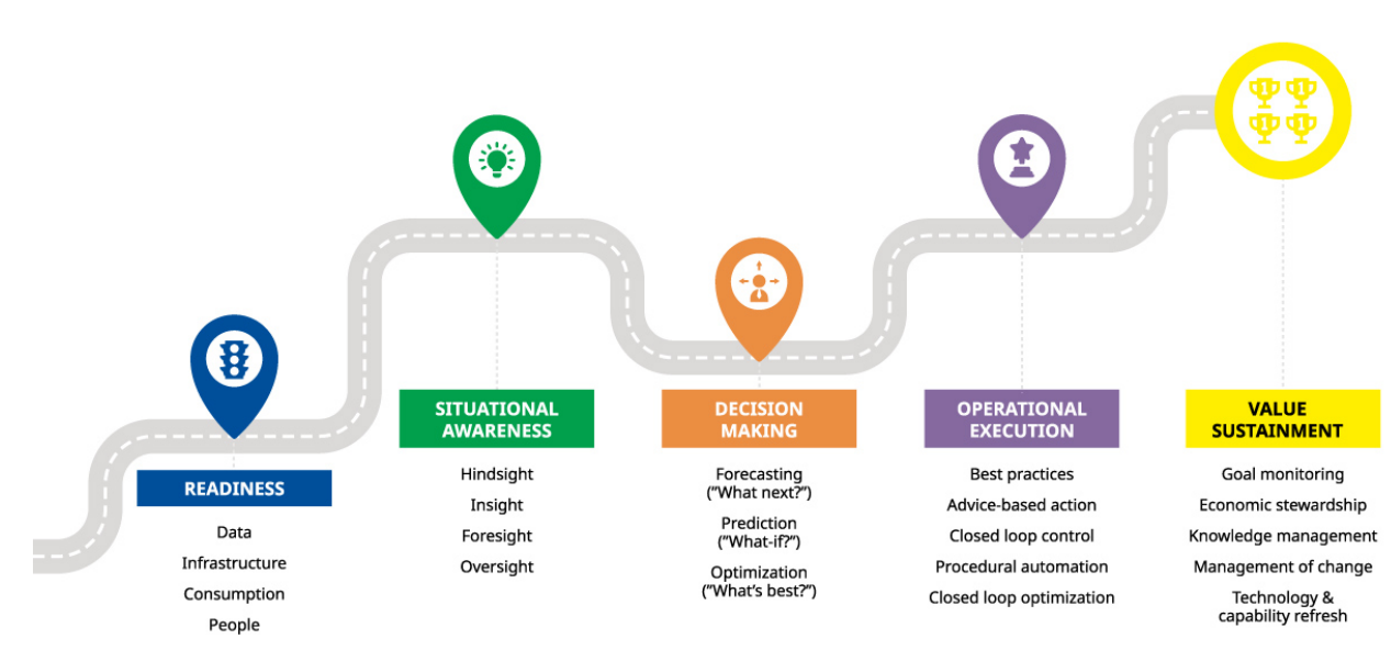 Today, companies are at various stages of their digital transformation journeys. A five-stage digital transformation roadmap has been designed to guide these initiatives (see Figure 1). When applied to specific operational challenges, this roadmap helps identify key considerations for recommending, designing, and building the necessary applications and capabilities to achieve and sustain excellence, while also addressing potential barriers to success.