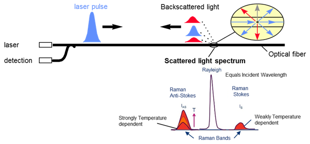 This phenomenon is also true when you shoot a pulse of light (laser pulse) off of a molecule, in this case, the fiberglass molecule in the optical fiber cable. When the light source enters the optical fiber cable, most of the light bounces (backscatter) back unchanged (no change in wavelength). However, a small amount of that light shifted/changed. That shift/change from the light source is called Raman Scatter. Since Raman Scatter is thermally influenced by temperature, the intensity depends on temperature. Distributed temperature sensing is capturing the shift/change from the propagating light pulse and measuring the intensities between the two signal components (stokes and anti-stokes).