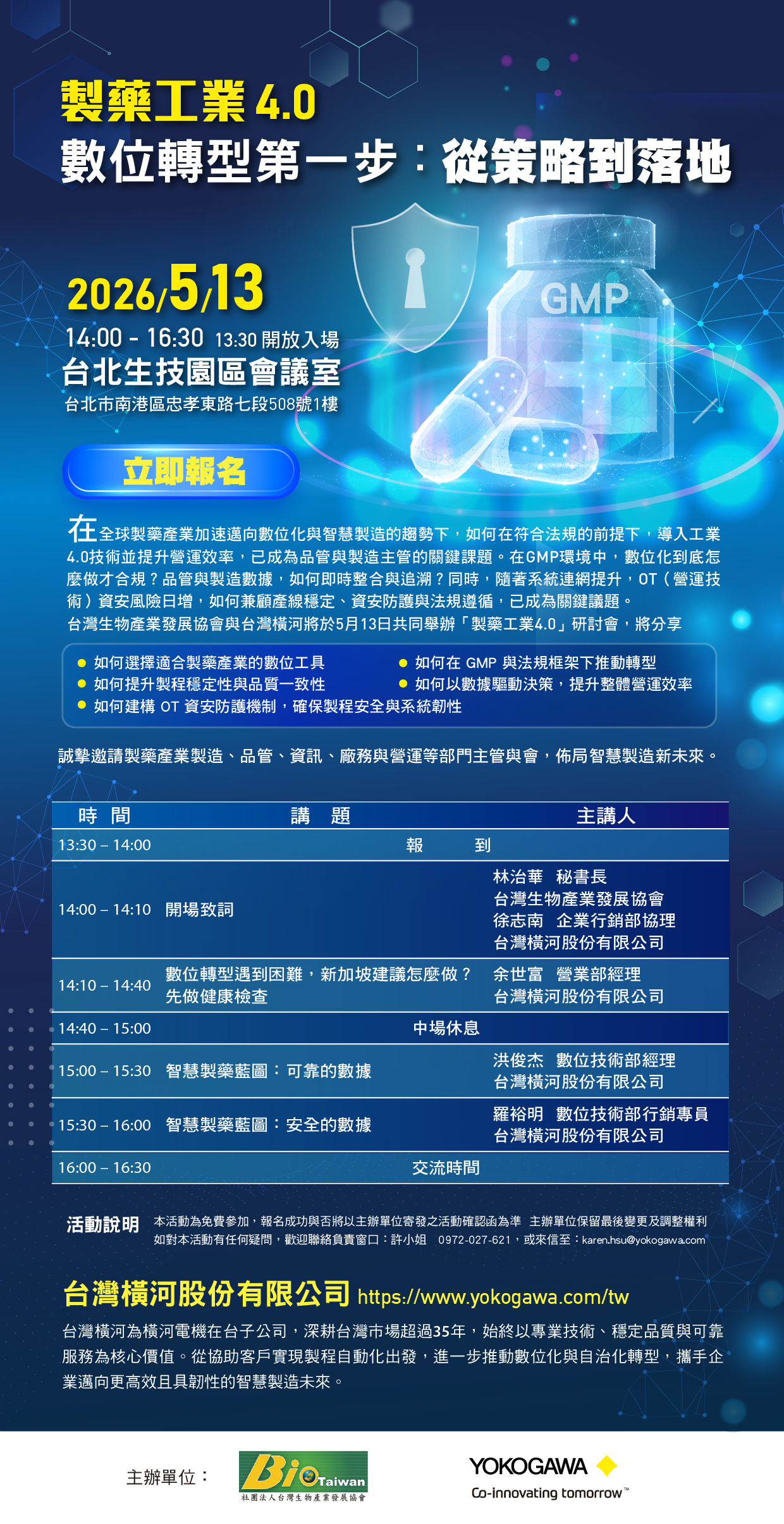 台灣橫河與台灣生物產業發展協會 將於5月13日共同舉辦「製藥工業4.0」研討會,將分享