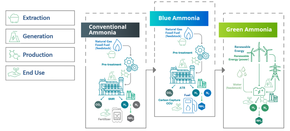 Blue Insights Blue ammonia, created by integrating carbon capture technologies and sustainable manufacturing practices into traditional ammonia production methods, significantly cuts carbon emissions. This innovative method supports eco-friendly agriculture with its use in fertilizer production and is a promising renewable energy source for green transportation fuels, power generation, and low-carbon industrial applications. By permanently sequestering CO2, blue ammonia helps fight global warming and promotes a carbon-neutral future for the planet.