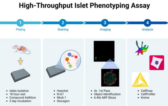 Figure 1. Workflow for high-content imaging of intact islets. (1) Islets are harvested from mice and placed in 384-well plates. (2) After fixation, islets are stained with Hoechst, Ki67, Nkx6.1, and Glucagon antibodies. (3) Imaging on a Yokogawa CV8000 with a 4X overview image of the entire well followed by centered 40 × 3D-imaging of each islet. (4) Images are analyzed with Cellpose and CellProfiler for islet and cell segmentation and feature extraction. Data analysis is performed using Knime. |