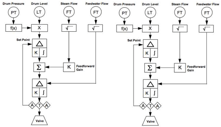 - Three-Element Control: Adds a cascade feedwater flow loop plus drum pressure compensation; ideal for high-performance systems. The level controller output sets the feedwater flow controller’s set point.
