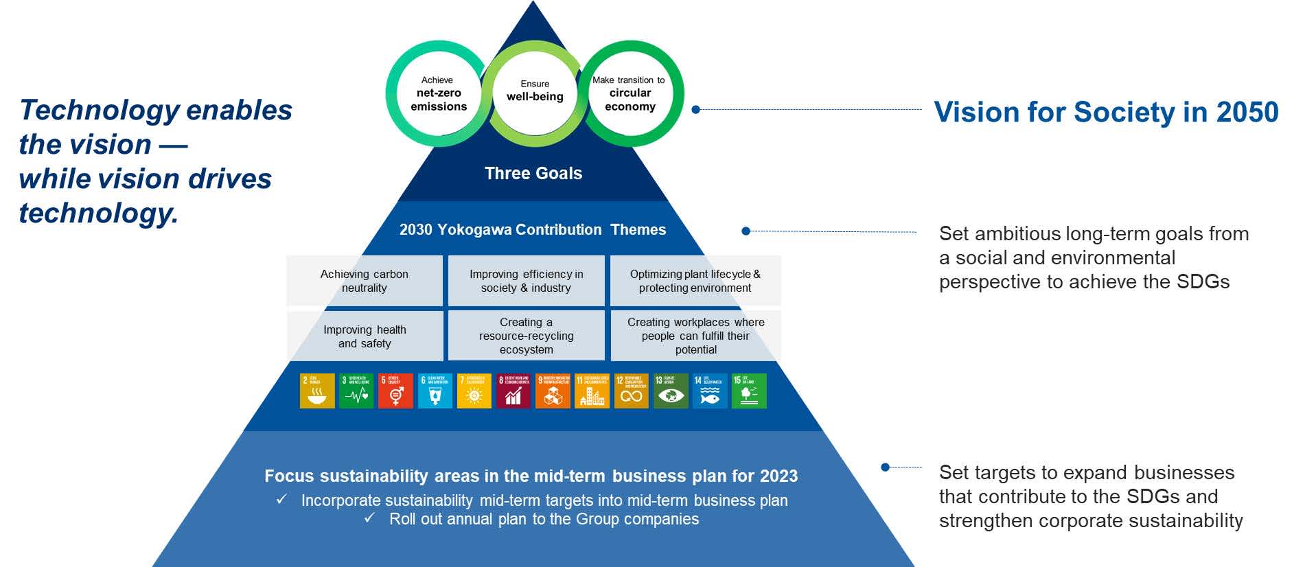 Yokogawa's vision and planning goals with milestones for the years, 2023, 2030, and 2050