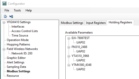 The holding register area (registers 4xxxx) is used only for devices with output values such as the FN510 which as a digital output function. Devices such as YTA510 temperature transmitter, EJXB series pressure transmitters, FN310 protocol converter and YTMX580 multi input temperature transmitter do not have any outputs and do not use the holding registers.