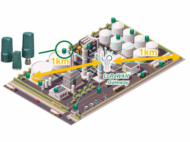 When installed in a plant environment, it is often possible to install a single LoRaWAN gateway in a central location capable of covering the whole facility, thanks to its one km radius range. Naturally geographically large facilities, such as a tank farm or well head site, may need more than one gateway. Since this network only serves the condition-monitoring sensors, data can be routed to the appropriate users, such as maintenance or reliability teams.